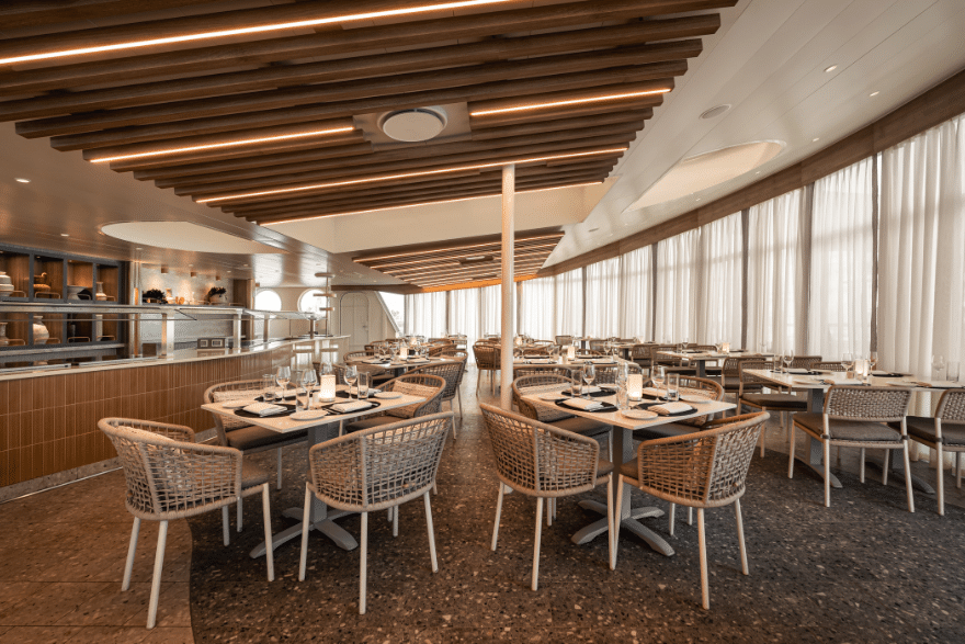 In April 2025, the 148-guest Wind Spirit, underwent phase one of its transformation. Similar to the process that’s already been completed with twin ship Wind Star, phase one focused on refurbishments of its reception area, retail space, and the lounge that’s adjacent to the Yacht Club Café. The World Spa by Windstar and the gym received fresh overhauls and new equipment. On the outside decks, there’s a new pool and whirlpool; the pool bar was enhanced. And the ship’s Owner’s Suite was completely revamped.