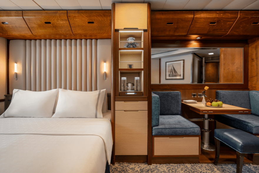 In phase two, guest staterooms were remodeled. Stateroom updates elevate comfort with new upholstered headboards, integrated lighting, and convenient bedside charging. Windstar built on Wind Star’s phase one enhancements; these included upgraded technology (Starlink connectivity and new TVs with on-demand content) and a redesigned Owner’s Suite.